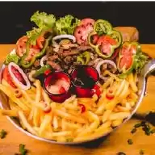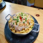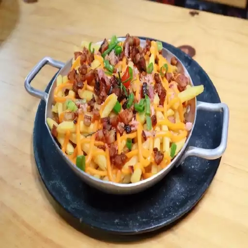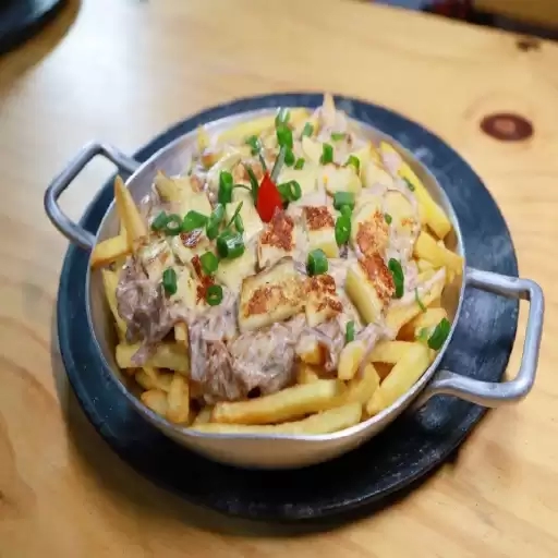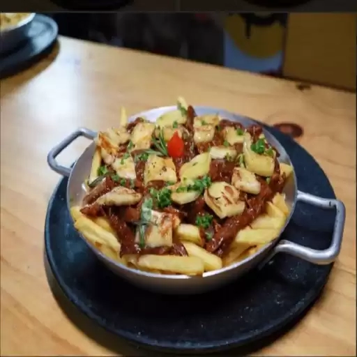 Deliciosa Batata Frita com costela ao molho barbecue e cubos de queijo coalho