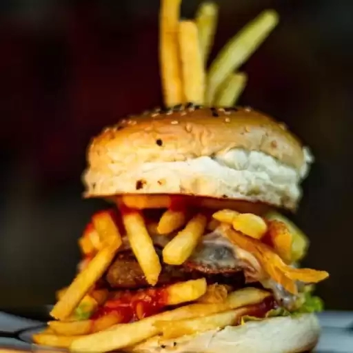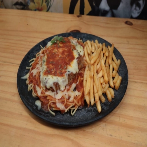 Pão selado na chapa, batata frita, blend 130g, molho de tomate, queijo mussarela e cebola caramelizada