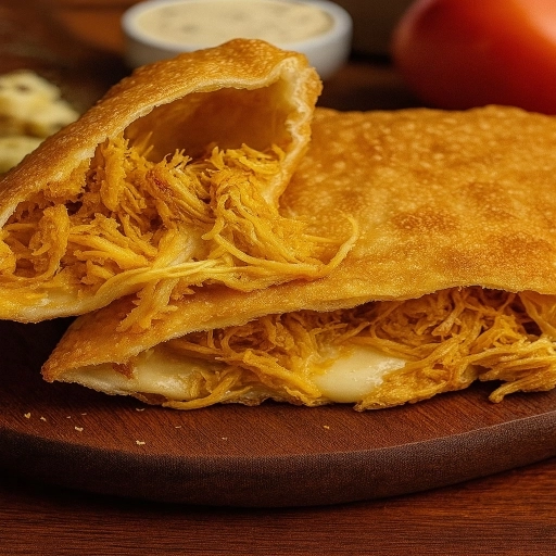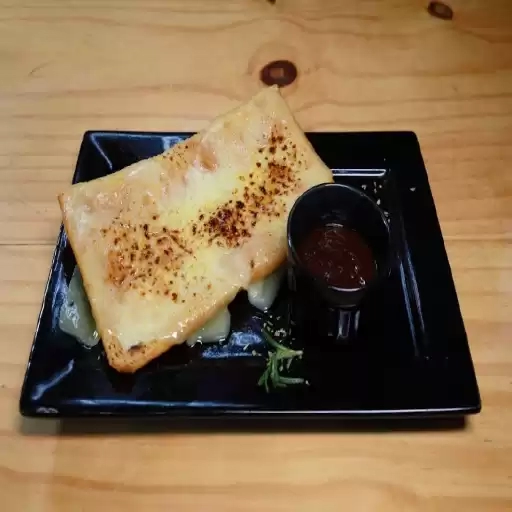 Pão empanado, salsicha, creme de camarão e queijo cheddar fatiado.