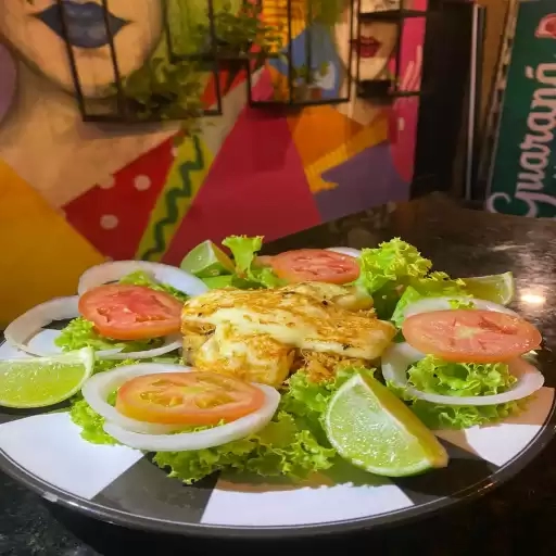 Blend 130g, crispy de macaxeira, queijo coalho e salada. Obs: sem pão