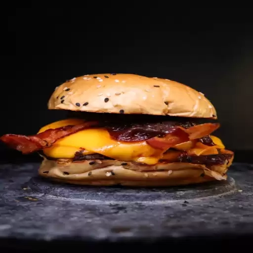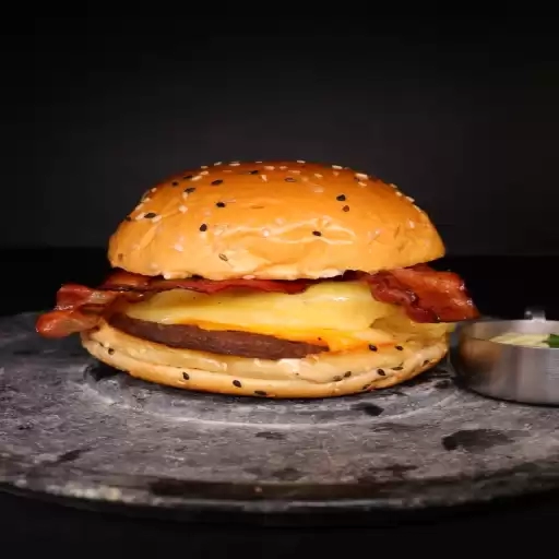 Pão selado na chapa, blend 130g, creme de cheddar cremoso e bacon..
