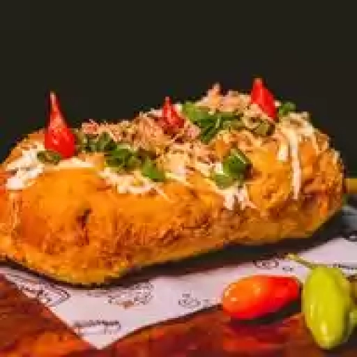 pão de leite, Carne de sol com nata, salsicha, milho/ervilha, cebola caramelizada e batata palha.