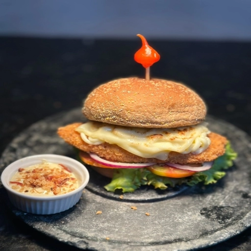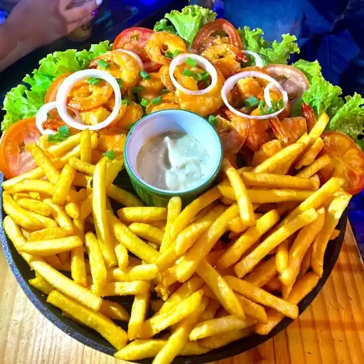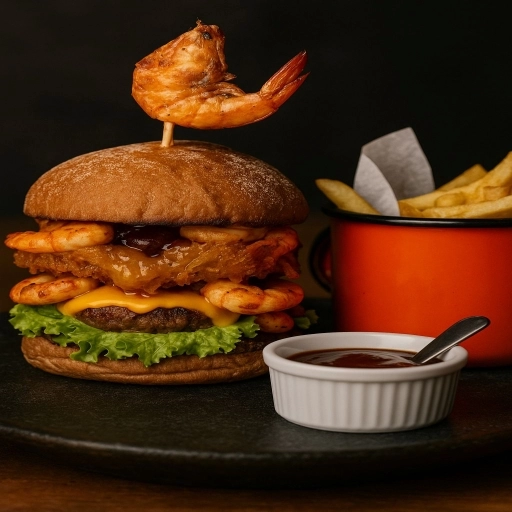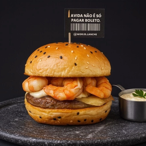 Pão selado na chapa, blend 130g, queijo cheddar fatiado, crispy macaxeira, queijo mussarela, filé de camarão, cebola ... Ver completo