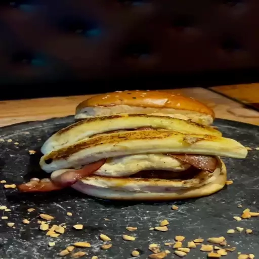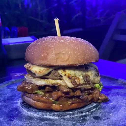Pão selado na chapa, blend 130g, ovo, carne de sol na nata, queijo coalho e cebola caramelizada