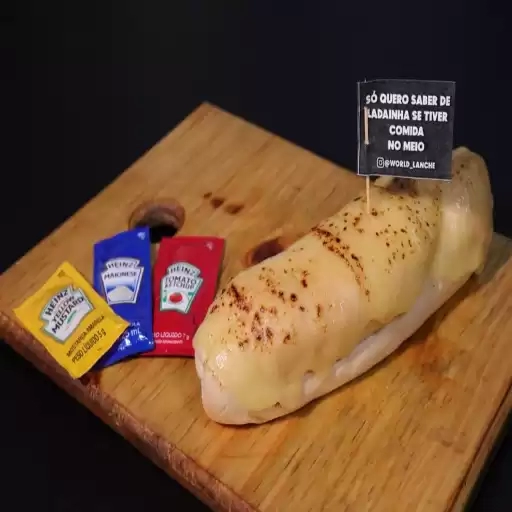 Pão empanado, salsicha, frango, bacon, queijo mussarela maçaricado e queijo cheddar fatiado