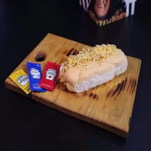 pão de leite, salsicha,bacon, frango, molho especial, milho/ervilha, cebola caramelizada e batata palha.